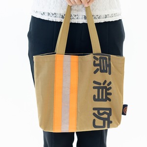 廃棄防火服の生地(防火・難燃・防水素材)で作製された耐久性のあるカバン。アウトドアシーンで幅広くご使用いただけます。(表は防火・難燃素材を使用、内側裏地は防水素材を使用しており、用途に合わせてリバーシブルでご使用いただけます。)